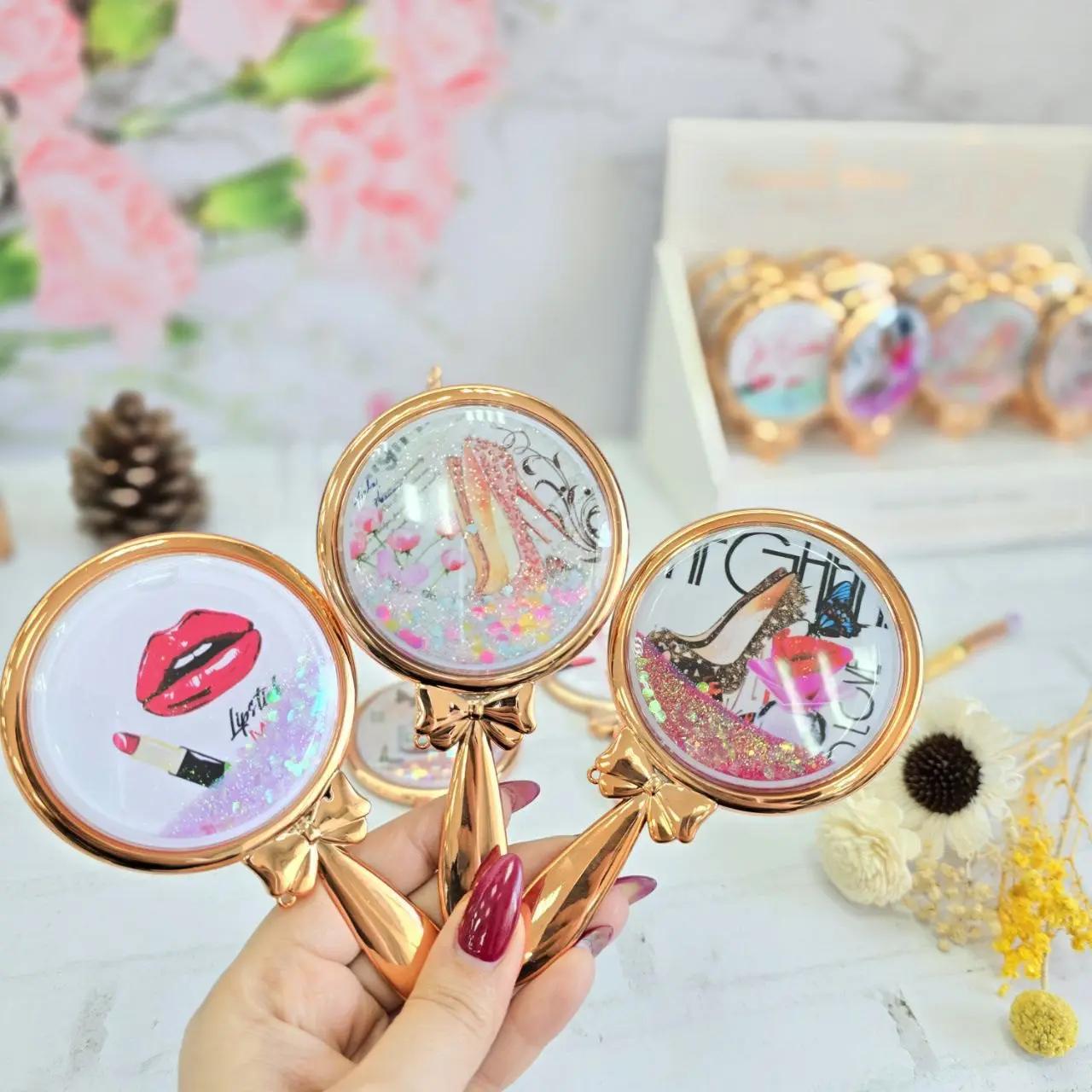خرید لوازم اشپزخانه / آینه / آینه دسته دار اکلیلی طرح رژ و لب دسته بژ