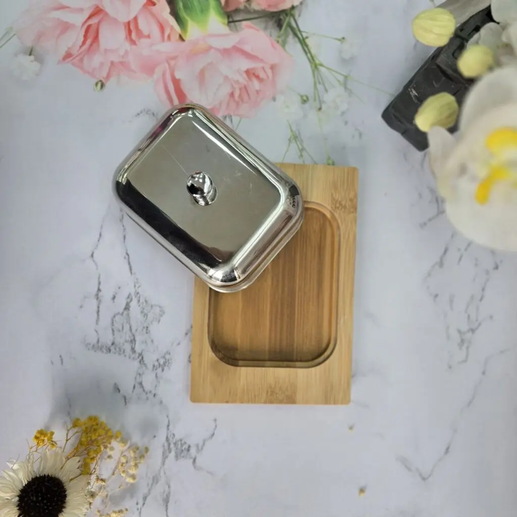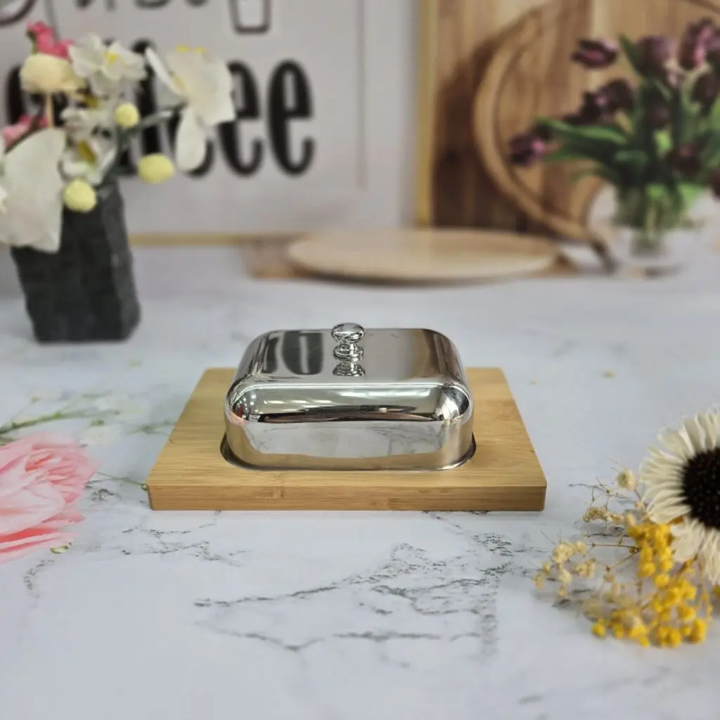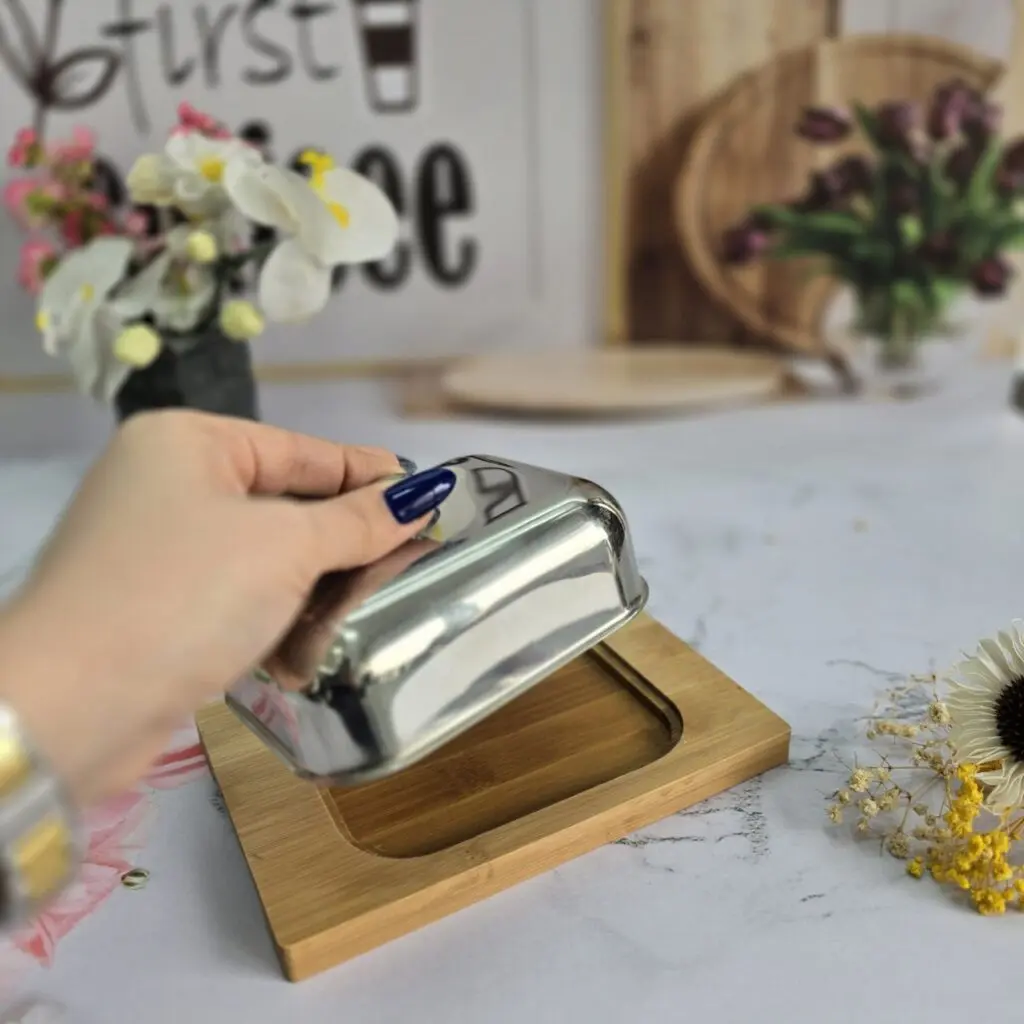 خرید لوازم اشپزخانه / ست پنیر و کره خوری / جا کره و پنیر درب استیل کف بامبو