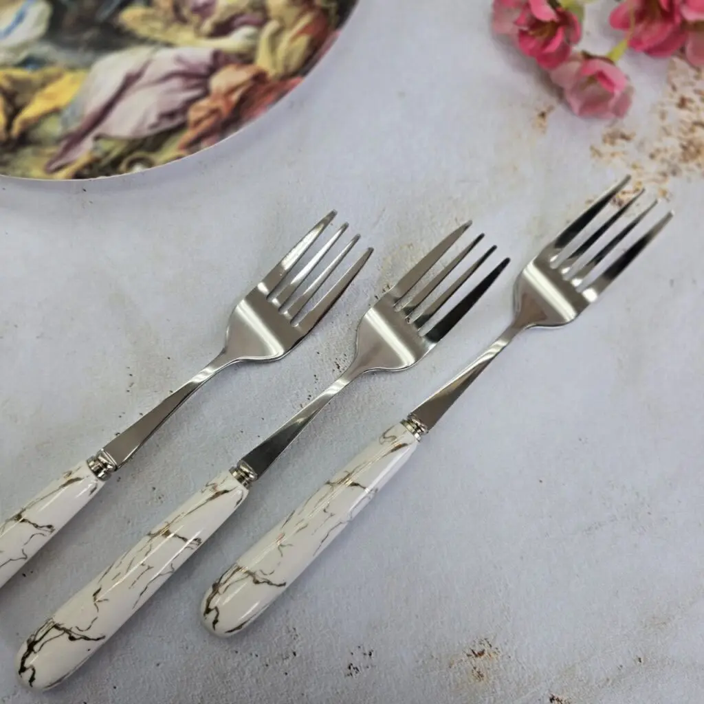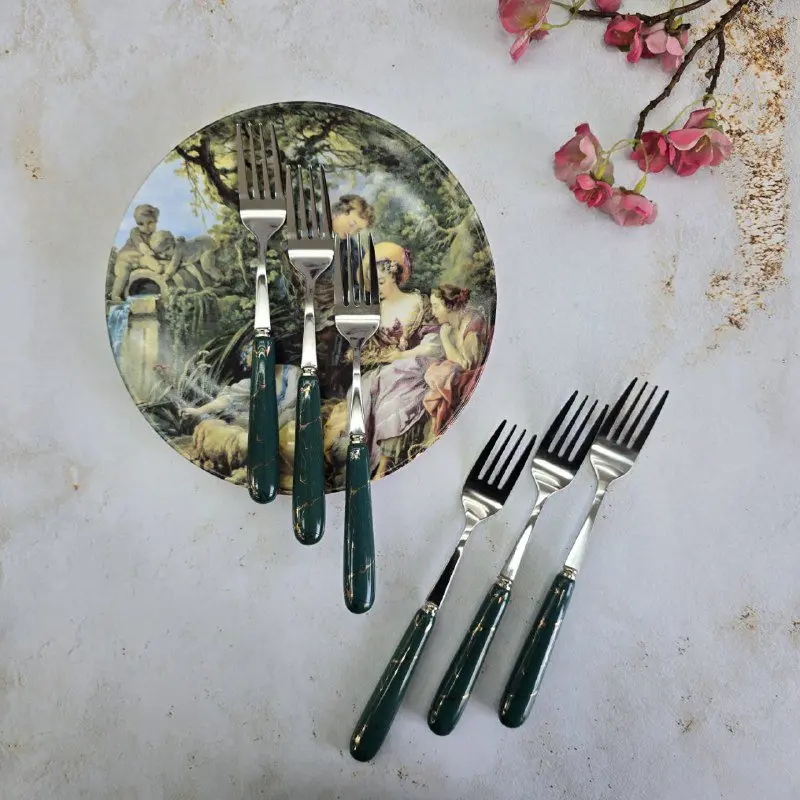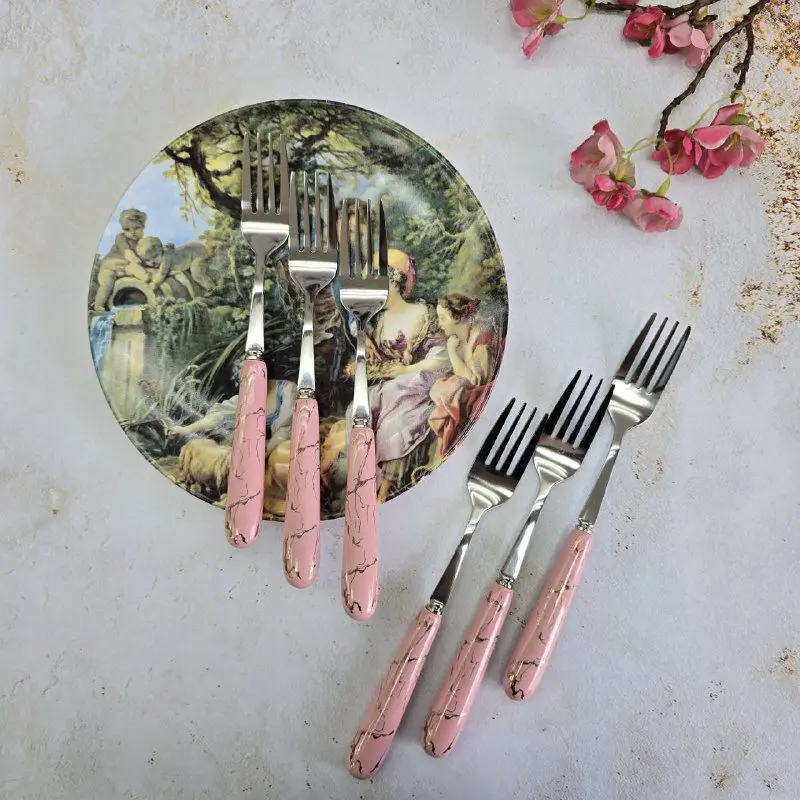 این ست چنگال نه فقط یک ابزار ساده برای خوردن غذا، بلکه یک اثر هنری است که جلوهای بینظیر به میز شما میبخشد. طرح ماربل، با رگههای ظریف و جذاب خود، حسی از لوکس بودن و طبیعت را به ارمغان میآورد و آن را از چنگالهای معمولی متمایز میکند. هر تکه از این مجموعه، داستانی از دقت در طراحی و توجه به جزئیات را روایت میکند.